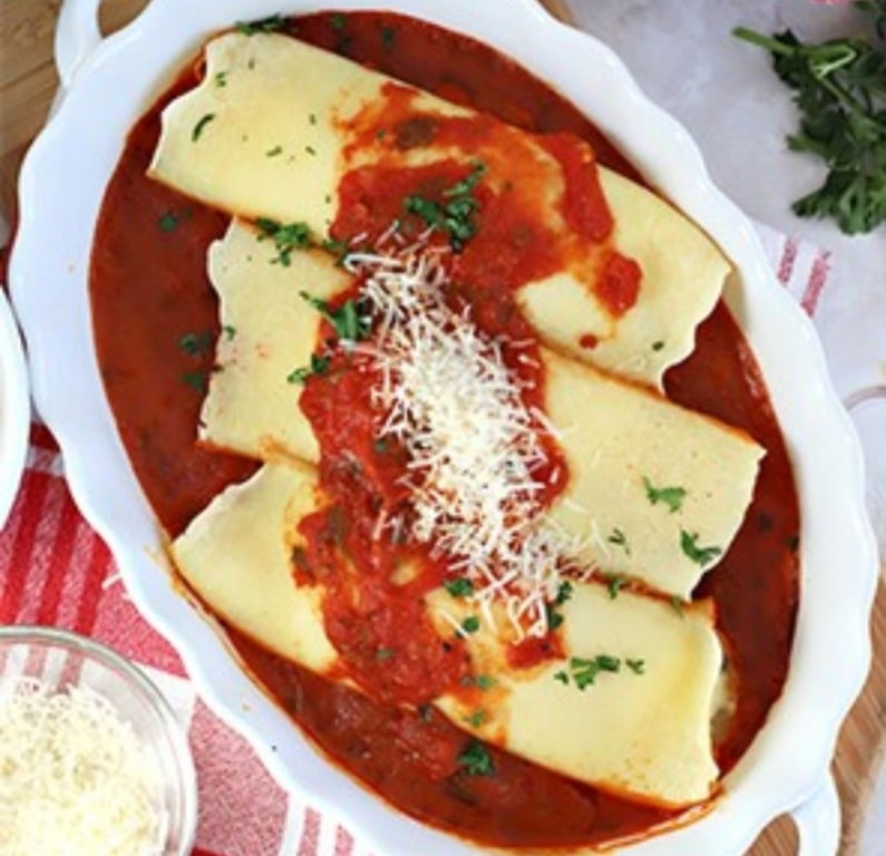 CHEESE MANICOTTI , TOPPED WITH MARINARA SAUCE AND MOZZARELLA CHEESE
