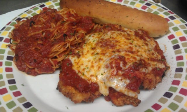 PARMESAN BREADED CHICKEN BREAST, BAKED & SERVED WITH SPAGHETTINI NOODLES AND MARINARA SAUCE
