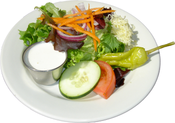 CRISP MIXED GREENS, TOMATOES, SHREDDED CHEESE.